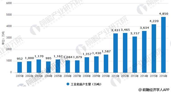 2001-2016年中國(guó)工業(yè)危廢產(chǎn)生量情況