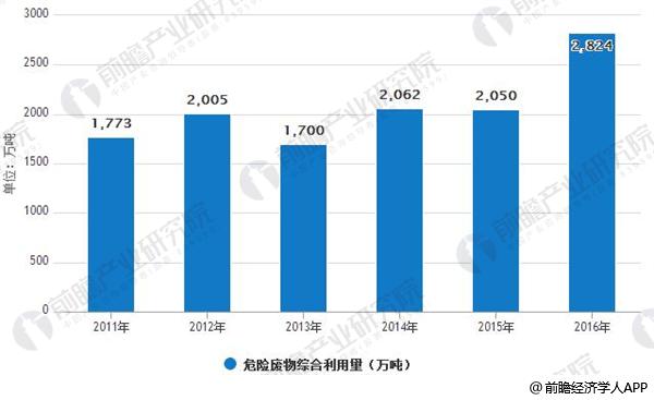 2016年危廢綜合利用量為2824萬(wàn)噸,同比增長(zhǎng)38%