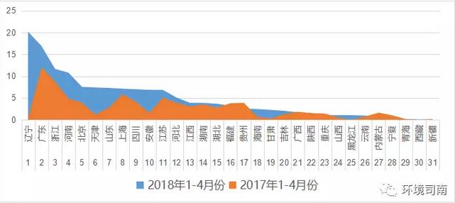 表1:2018年1-4月份各省新簽項目首年服務(wù)金額排名(單位:億元)