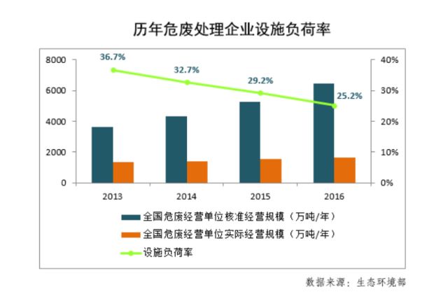 據(jù)生態(tài)環(huán)境部數(shù)據(jù)顯示,危廢處置企業(yè)的設施負荷率常年處于低水平運行,且有逐年下降趨勢。處理資質(zhì)與市場需求錯配,導致產(chǎn)能結構化過剩。同時,產(chǎn)能區(qū)域性布局不合理亦是造成危廢處置企業(yè)整體負荷率低的重要因素。