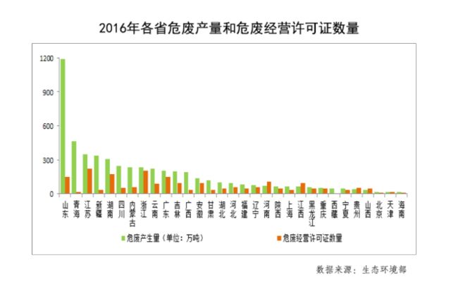 2016年,持證企業(yè)數(shù)量最多的省份是江蘇,有221家,占全國持證總數(shù)的10%。而危廢產(chǎn)量第二的青海省,持證企業(yè)僅有19家,且核準的經(jīng)營規(guī)模不到危廢產(chǎn)量的1/10,市場供給嚴重不足。